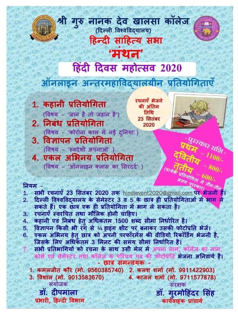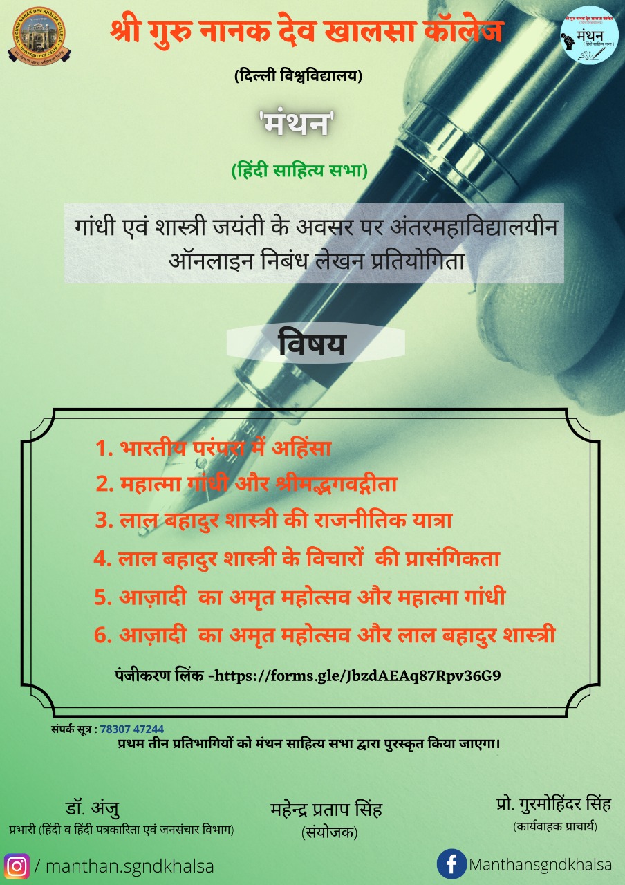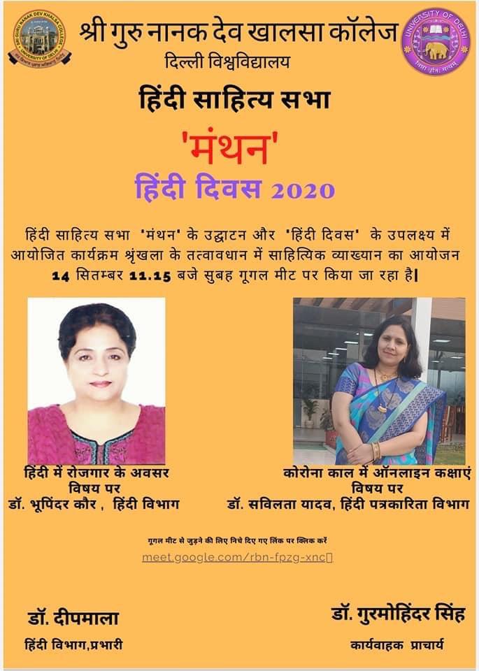 हिंदी साहित्य सभा 'मंथन' श्री गुरु नानक देव खालसा कॉलेज की 'निज भाषा उन्नति अहै' को पाथेय मानते हुए हिन्दी को समर्पित कर्मठ छात्र संस्था है। यद्यपि यह संस्था हिंदी और हिंदी पत्रकारिता एवं जनसंचार विभाग के छात्रों एवं शिक्षकों के समन्वय से संचालित है, इस सभा का मूल उद्देश्य छात्रों में हिंदी भाषा और साहित्यिक जागरूकता और रुचि पैदा करना है।
