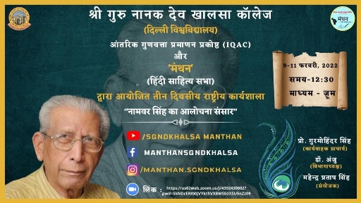 ● 'मंथन' हिंदी साहित्य सभा द्वारा 9-11 फरवरी, 2022 को 'नामवर सिंह के आलोचना संसार' विषय पर एक कार्यशाला का आयोजन किया गया। इस कार्यशाला में हिंदी के जाने-माने विद्वानों द्वारा श्रद्धेय नामवर सिंह जी के आलोचना संसार को प्रतिभागियों ने बखूबी जाना।